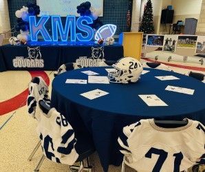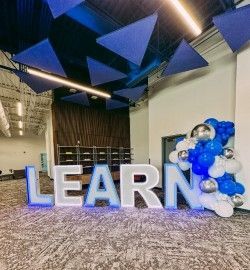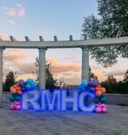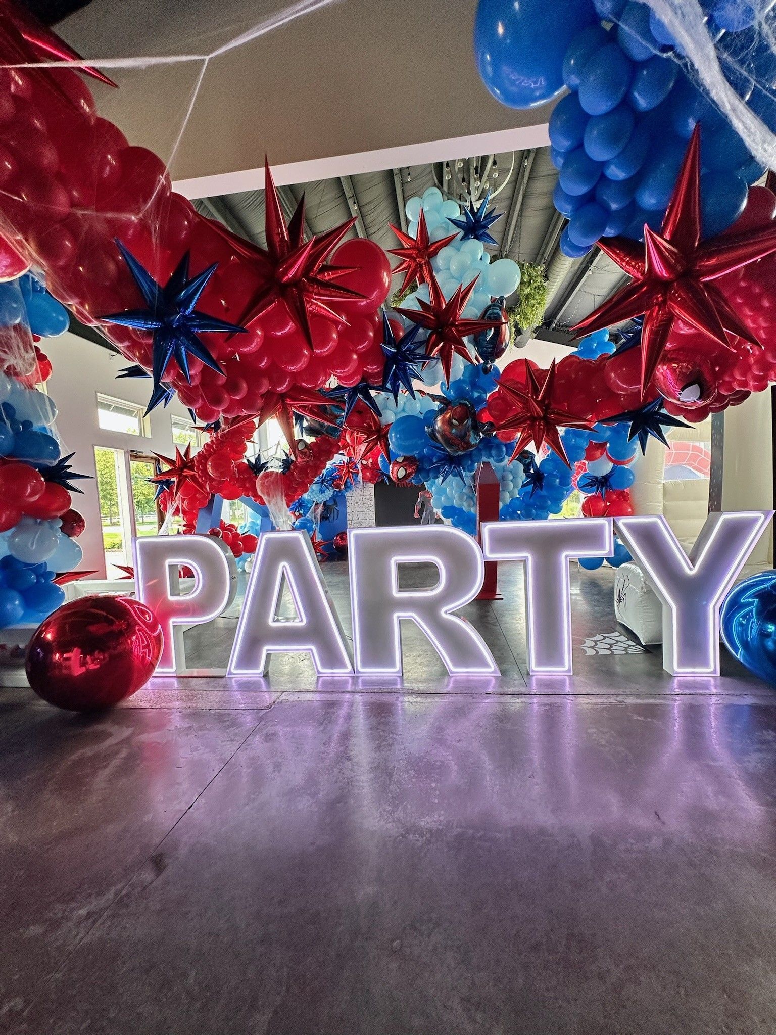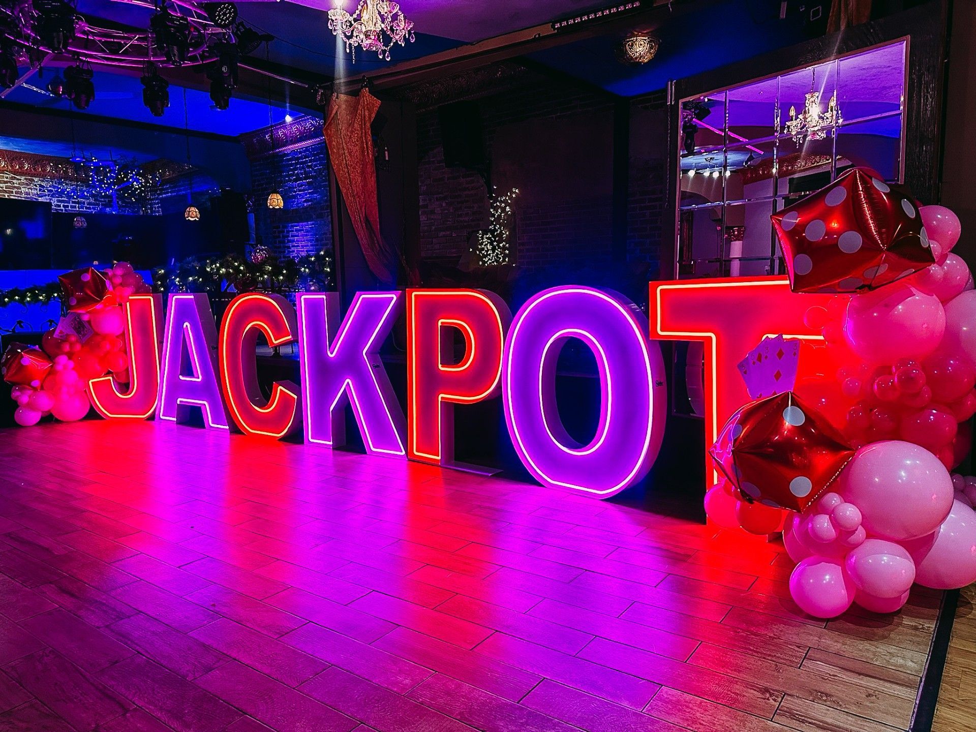 A glamorous event backdrop featuring bold, pink LED marquee letters spelling "MANIFEST" surrounded by a luxurious organic balloon garland in shades of pink, purple, gold and white. The display is accented with gold and pink starburst decorations, disco balls, and metallic elements, creating a dazzling, high-energy atmosphere. Perfect for empowerment events, galas, and luxury celebrations, this statement setup exudes elegance and sophistication. 2/22/25
